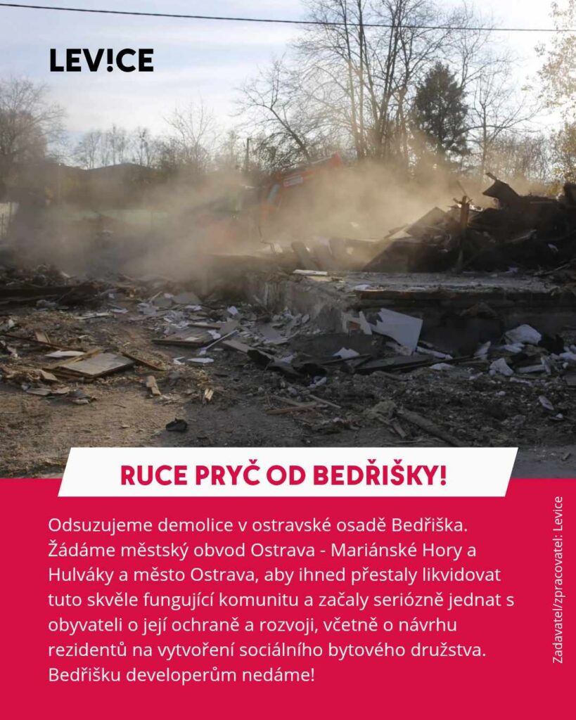 Strana Levice ostře odsuzuje demolice v ostravské osadě Bedřiška a žádá městský obvod Ostrava-Mariánské Hory a Hulváky a město Ostrava, aby okamžitě zastavily likvidaci této skvěle fungující komunity a začaly seriózně jednat s obyvateli Bedřišky o její ochraně a rozvoji, včetně o návrhu rezidentů na vytvoření sociálního bytového družstva.